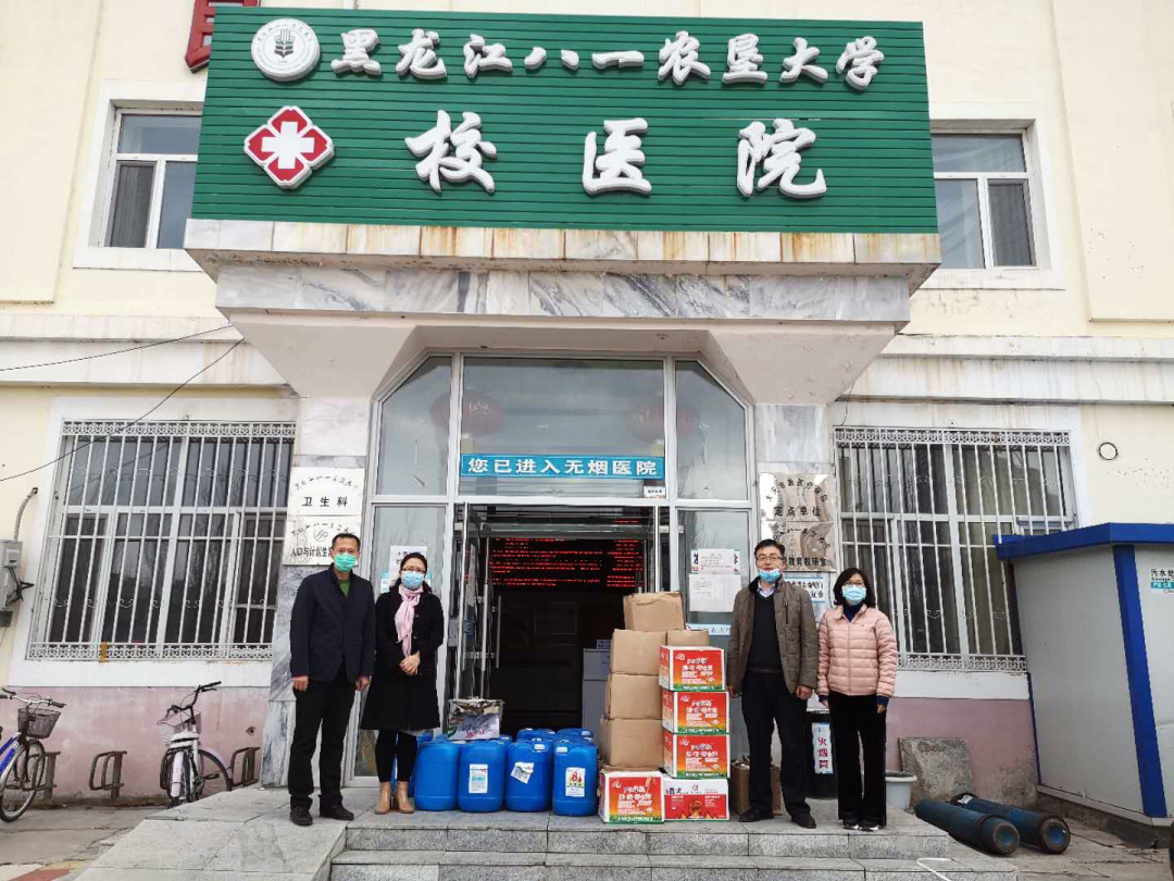 4月8日,接到防疫物资后,公司党总支书记沈鸿、副经理杨凤军、党总支副书记张南、综合办主任张吉一行前往校医院,将捐赠的84消毒液送达,并转达了山东金农华药业有限公司对公司全体教职工以及奋斗在一线的工作人员的慰问。