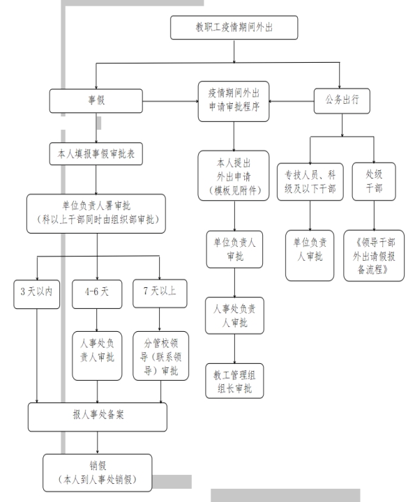疫情期间,教职工因私事或公务出行离开大庆,除正常履行事假或公务出行审批程序外,同时履行疫情期间外出申请审批程序,流程图如下: