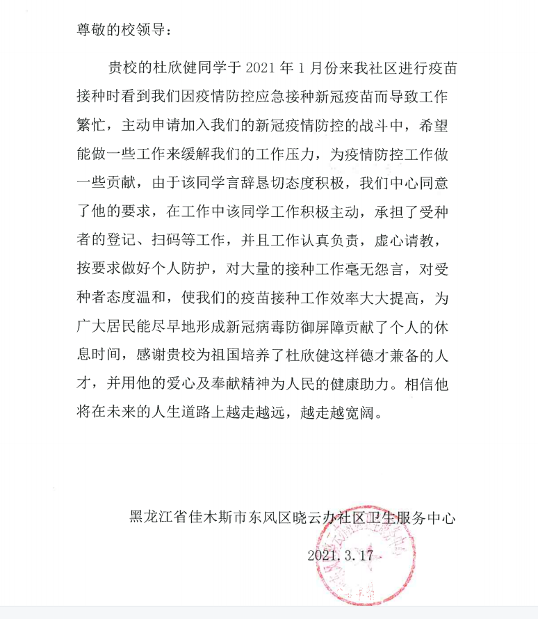 公司2019级园艺专业一班员工杜欣健在疫情防控中表现积极,受到当地表扬。望广大艺林学子向他学习,发扬志愿精神,奋斗在最需要的地方,绽放绚烂的青春光彩。