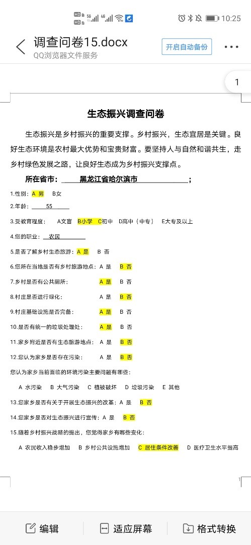 本次社会实践活动,共回收十五份线上调查问卷。通过对问卷的归纳整理,了解到现如今农村的生态建设,设施基本完善,基本了解生态振兴对于乡村发展的意义,但村民缺乏对于生态资源的利用,加之年轻生产力的缺乏,经济发展普遍落后。团队成员也深刻的体会到员工工作的辛苦,体验到农业生产全过程,这对专业生产实习起到了很大的作用,了解到一些书本之外的操作流程,充实了理论知识。结合书本与实践知识,切实了解农村生产现状,也培养了艰苦顽强的垦荒精神,努力成为新一代有知识、有品德、有作为的新一代建设者,准备着为实现中华民族伟大复兴而奋斗。