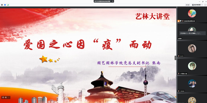 会议中,张南副书记传达了10月3日董广芝书记“国庆一课:国庆节里谈爱国”报告精神,并结合当前疫情防控形势、公司公司疫情防控情况,通过摆事实、讲道理,引导广大学子在非常时期,将爱国之心化作实际行动,牢固树立“高度自觉、上下一心、自我防控”的小我精神,凝聚艺林学子大我之力,严格遵守公司的疫情防控措施,严格约束自己的行为,一同助力我省取得疫情防控的最终胜利!