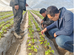 专家们走访了农户付玉学的甜瓜大棚,详细了解薄皮甜瓜的种植状况以及管理情况。3月10日薄皮甜瓜定植后,植株长势较弱,黄化明显。经调查,由于定植后地温过低,导致根系伸展受限,吸收受阻。杨升建议,薄皮甜瓜定植后应特别重视土壤湿度和温度调控,促进生根,确保甜瓜正常生长。孙明哲建议根据土壤养分状况和甜瓜生长需求,制定合理的施肥计划,以提高土壤肥力。