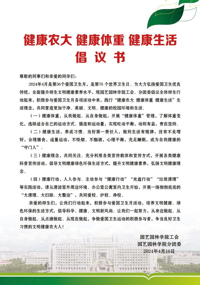 围绕“健康农大,健康体重,健康生活”这一主题,公司工会与分团委向全体师生发起倡议,号召师生积极参与爱国卫生月活动,养成文明健康、绿色环保的生活方式,倡导科学、健康、文明新风尚,争做爱国卫生运动的积极参与者,争当良好卫生习惯的文明健康农大人。