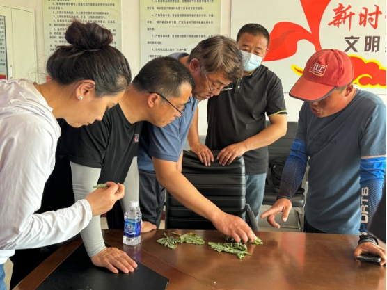 在授课现场,种植西瓜的罗光波把西瓜病样拿到现场,靳亚忠和杨升两位老师进行仔细查看,初步认定为近期雨水过大、气温时高时低导致的西瓜发生霜霉病、叶枯病。随后专家深入田间查看症状,明确西瓜发生轻微霜霉病、叶枯病等病害,并开出药方,指导罗光波后期管理注意事项和防控措施。