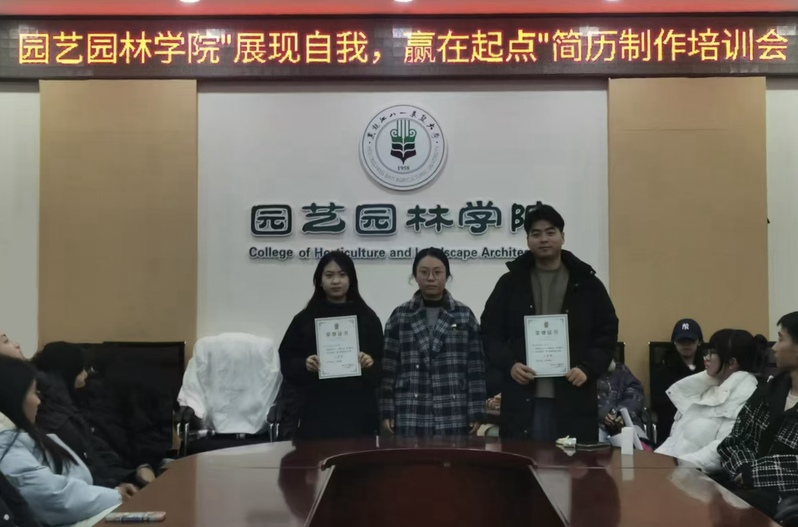 在校第六届简历设计大赛中公司杨再芳、马正山同学分别获二等奖、三等奖,辅导员任国翠老师为两位同学颁发证书。