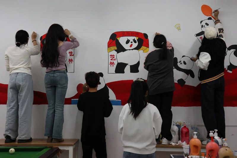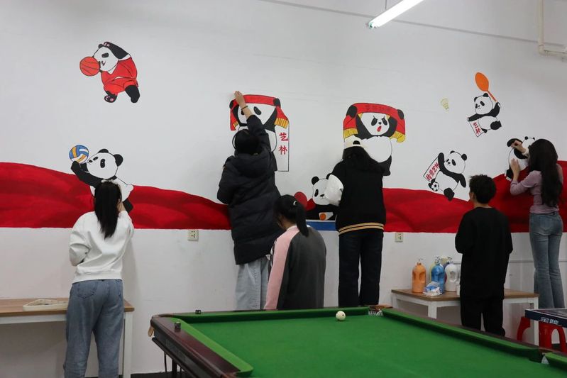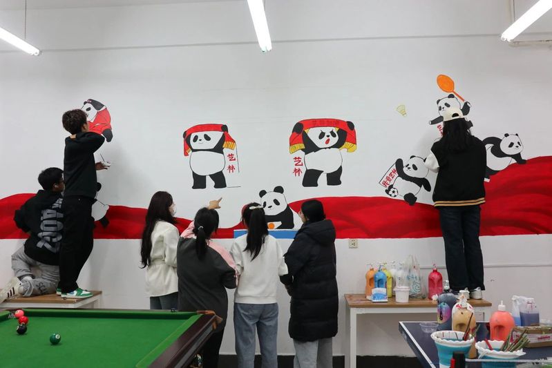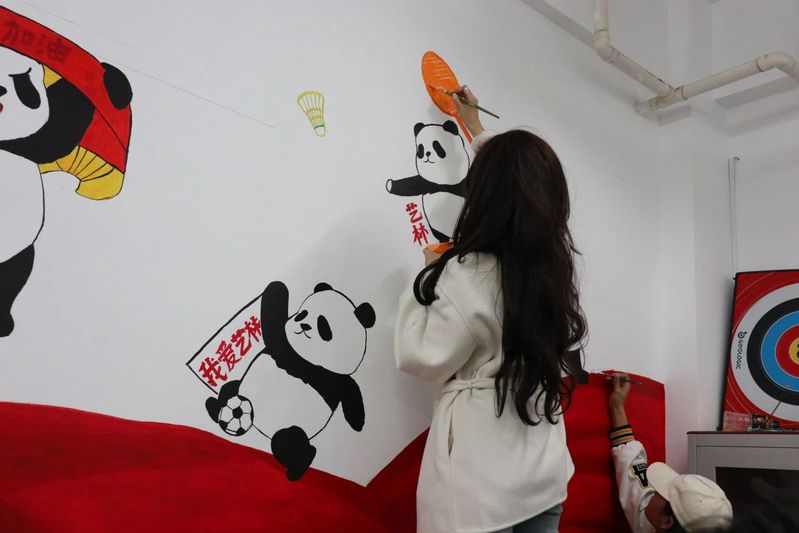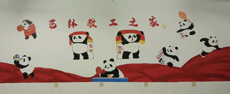 为营造轻松愉悦的工作环境,打造温馨、舒适、功能齐全的艺林工会之家,促进全院教职员工幸福感、获得感、归属感,增强教职员工凝聚力和向心力。 公司员工以奥运会熊猫徽章为原型绘制艺林工会之家。