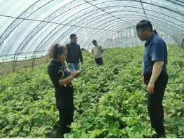 在二井镇黎明村,一行人在二井镇党委书高秀军书记和村党委书记张晓利带领下查看了温室种植香瓜、冷棚种植菇娘和露地小拱棚种植菇娘、露地大蒜、冷棚种植的茄子生长情况,发现菇娘生长旺盛,也出现菇娘植株发生枯萎病,叶片中存在白色斑点等现象,经过询问得知前期温度低生长慢,后期温度升高,生长旺盛,种植户还购买了农药和中微量水溶肥,进行了防病和促生。在查看冷棚茄子后,发现茄子发生了叶片发黄现象,经过查看和询问后确定茄子发生了黄萎病,专家们结合实地问题给出了解决茄子黄萎病防治的方法,并赠予种植户木霉菌复合菌剂,建议在后期进行灌根处理。在繁荣村助农工作站,了解到繁荣村开展了富硒玉米-养猪循环农业种养结合模式,并对于生产中存在的玉米水肥一体化遇到的问题进行了指导服务工作,提出了合理解决的建议。
